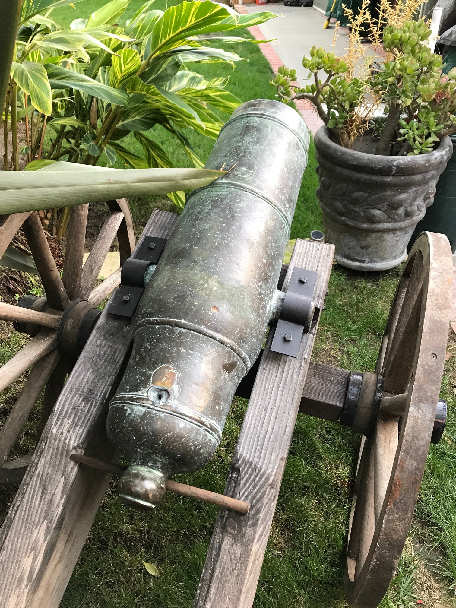 A Very Interesting & Rare 16th-17th Century European Bronze Cannon. Unfortunately no maker's marks. The form is know as a 'Howitzer' or 'Bombard'. 6.5" bore at muzzle that tapers to a smaller diameter inner powder chamber (see photos). The original touch hole was plugged and a another was drilled out just behind the original during the period of use. Heavy green age patina.