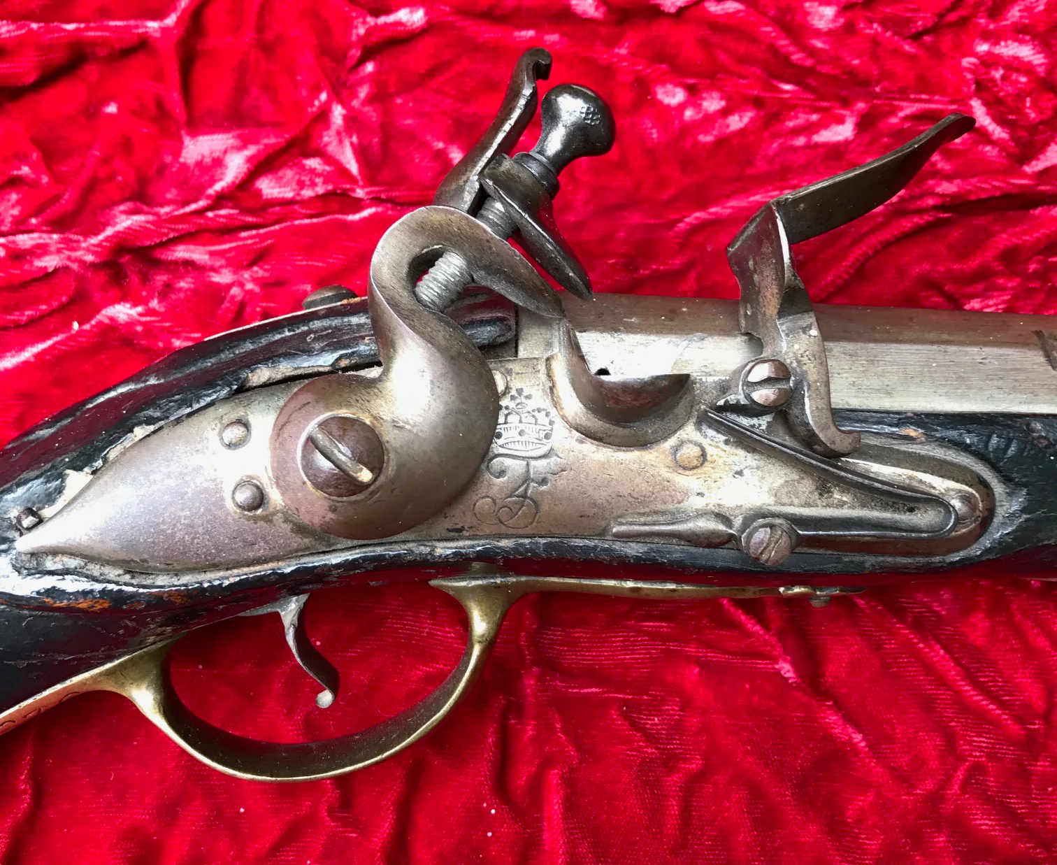 A Rare Early Pattern 1751 Danish Heavy Dragoon Flintlock Pistol Reign of King Frederick V of Denmark, circa. 1750's. 12.5", .70 cal. steel octagon-to-round barrel with brass blade front sight; stamped on the top flat at breech with King Frederick V arsenal mark; engraved on the left flat at breech with regimental marks 'No. 60 = C'. Regulation pattern brass furniture includes a trigger guard engraved with regimental marks 'F No. 36', 'J F R'. The lock is engraved with a 'CROWN' over 'F5' (King Frederick V reigned 1746-1766). The stock is solid with scratches, dings and heavy wear from years of service. The pistol is in it's original flintlock configuration and in good mechanical working order. 19.5" overall length. Seldom encountered for sale...