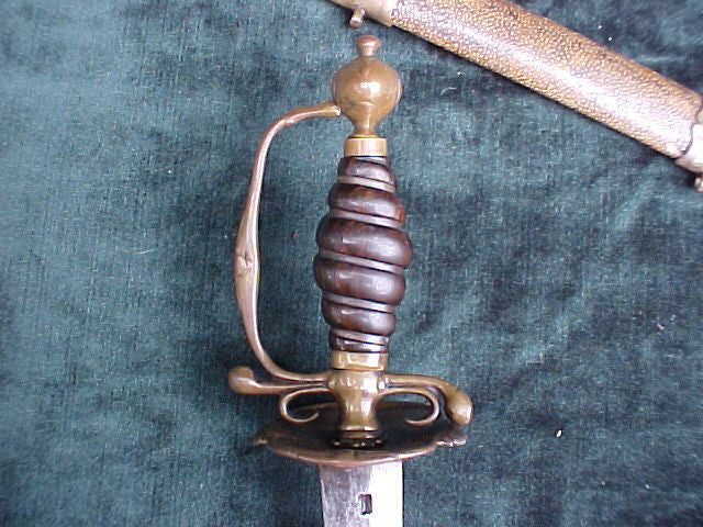 An Interesting antique Colonial French and Indian - American Revolutionary War English, French or Dutch Small Sword, circa. early 18th century. 22.25" double edge blade that may be much older and re-used w/(3) unidentified armorer's marks on both sides of blade . Brass hilt/guard; carved spiral/twisted wood w/flat wire grip. 29" overall. Scabbard is brass mounted covered in shagreen (Sting Ray Skin).
