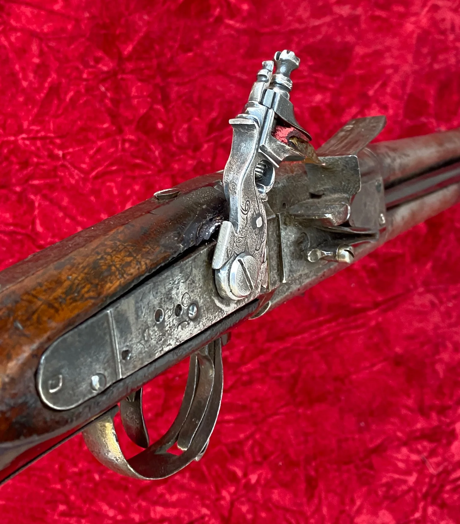 *The RED background are up-dated photos. I was extremely lucky to acquire the proper period correct cock (hammer) ! The cock that came on the pistol when we purchased it, is an 18th century replacement.