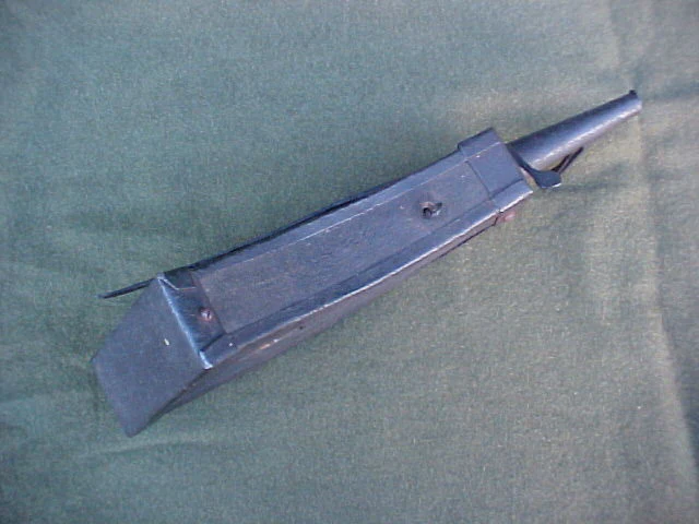 A Fantastic Antique 17th Century Wheel-Lock Powder Flask w/Pistol shot hole, circa. 1630 (most likely Saxon/German). Formed of flat wood panels. Some replacement screws, otherwise all original parts including belt hook. Measures; 12.5" overall length. In good working order. A wonderful flask that clearly exhibits an entry and exit from a pistol size shot !!!
