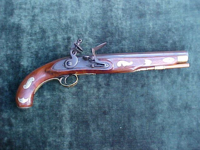 A Massive Fantastic Antique American Kentucky Flintlock Pistol, circa. 1740/1815. 10. 1/8" round iron barrel w/(2) Birmingham PROOFS, smooth bore, and original plumb brown finish. Lock is from a very early British Royal Navy Sea Service Pistol (c.1740) w/all of the external marks intentionally removed during the period upon construction however, the original arsenal inspector's marks on the interior remain, cock is from a British Military New Land Pattern Light Dragoon Pistol. English style brass furniture w/trigger-guard, side plate, wrist escutcheon, and American nose cap engraved by maker. Engraved Silver butt cap matches (11) other Silver inlays set in the stock. The stock is solid w/the exception of an old stress crack just under the rear of the lock plate, and a period spliced section of wood at the muzzle, (Note; it is our opinion that this was done by the American maker during the period this pistol was being made/assembled, c.1815 because all the work matches the balance of the gun.) Otherwise, the stock is exceptional w/minor scratches and dings from years of handling. 17" overall length. An absolutely stunning American Kentucky flintlock pistol in remarkable condition and good working order. One of the best we have seen...