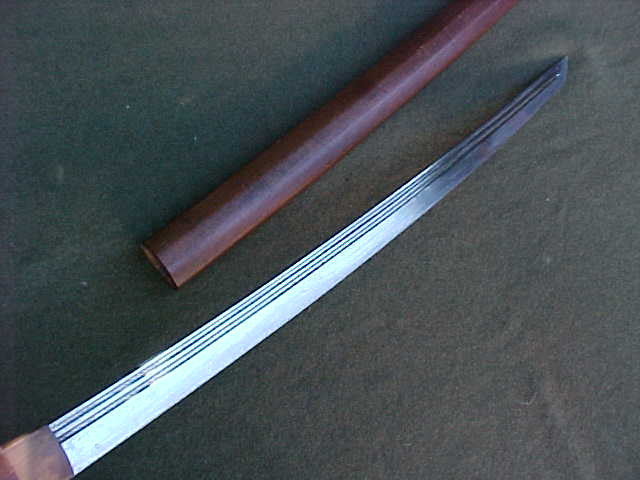 An Antique Japanese Koto - Early Edo Period Wakizashi Blade in wood storage saya. 20" edge, 25 5/8" overall blade length with double fuller including the tang. The tang is signed on both sides. The storage saya has remnants of Japanese writing on both sides. Storage saya measures 31" overall. Blade needs to be polished to bring out the hamon. A worthy candidate for restoration...